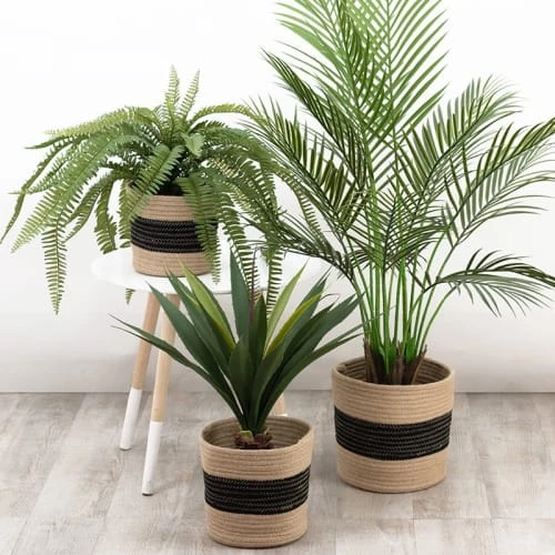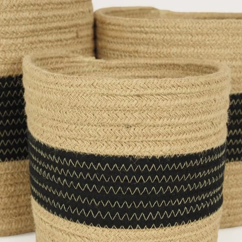 Optez pour ce lot de 3 cache-pots paniers tissés en coton bicolore, couleur naturelle et noire. Idéal pour donner une touche de naturel à votre déco !