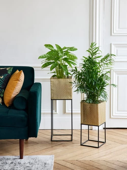 L’intérêt des 2 cache-pots sur pied Charles est d’apporter volume et mouvement. Tout en libérant la place au sol, ils créent un espace bien construit. Agencées idéalement, les plantes d’intérieur vous font profiter de toutes leurs qualités. Que vous les ayez choisies souples et touffues ou sobres et graphiques, elles sont mises en avant avec ces supports pour plantes vertes. Les cache-pots en métal doré font des miracles dans votre séjour, votre salon, dans une chambre, une entrée ou votre véranda.