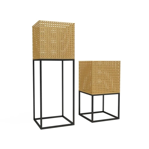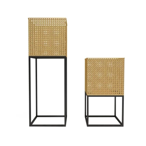 Les 2 cache-pots sur pied Charles s’inscrivent pleinement dans la décoration de votre intérieur. Adieu pots de fleurs posés par terre et porte-plantes improvisés, tout le monde s’habille ! Ces deux supports pour plante en métal et effet cannage donnent l’occasion d’une mise en scène soignée, aux volumes agréablement travaillés. L’apparence sophistiquée du métal doré vient à la rencontre du cannage beige naturel. Elle rappelle autant les valeurs intimistes et cossues du boudoir, que l’esprit de liberté bohème. Vous penserez aussi au style du loft : la structure aérienne, l’alternance du vide et du plein, la géométrie métallique, parlent d’elles-mêmes. En d’autres termes, ces 2 cache-pots sur pied Charles accueilleront avec la même hospitalité un petit fauteuil bohème chic, un pouf rond ou une banquette tendance.